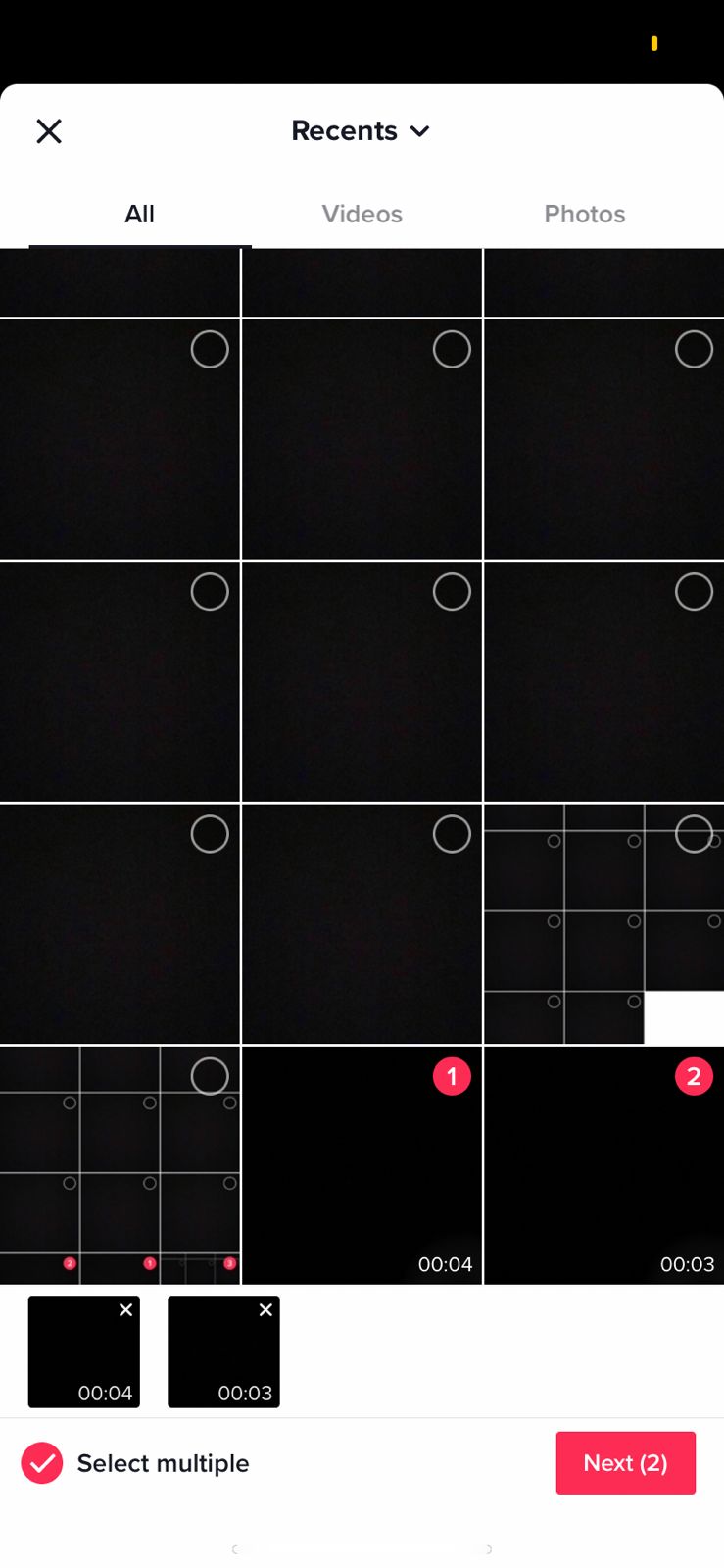 Tick Select multiple, then select the videos to combine. - After selecting your videos, click Next.TikTok will now combine the videos into a single video, which can be edited as one. You can add music, trim the clips and add stickers. Once happy with the outcome, click Next and your video will be ready to be posted.